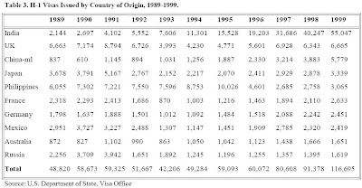 In 1999, UK and Philippines hadn't seen much growth in the H1 numbers and represented 5% and 2% respectively. While, India's numbers show a gargantuan change: 55, 047 / 119,000 odd. Almost 50% of the H1 job population. Even as China's numbers have grown, their share in this has not.